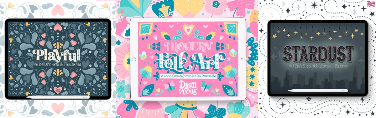 I also used a variety of my Procreate Stamps for the five designs I came up with, most of which are from the following sets.